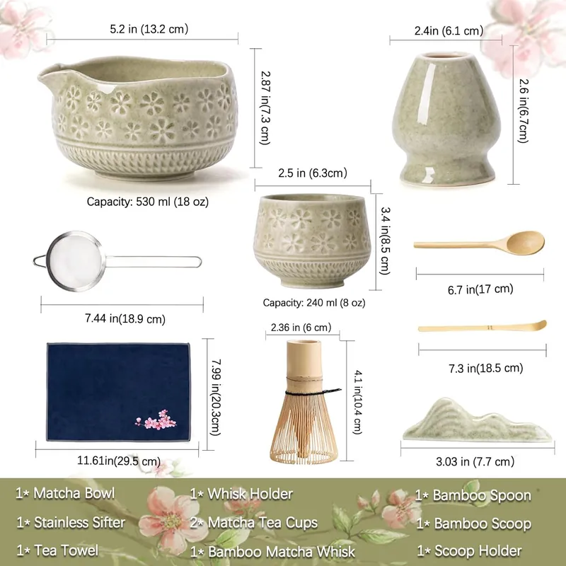 10 Piece Matcha Whisk Set with Bowl 2 Cups Whisk Holder Scoop Sifter Towel 11