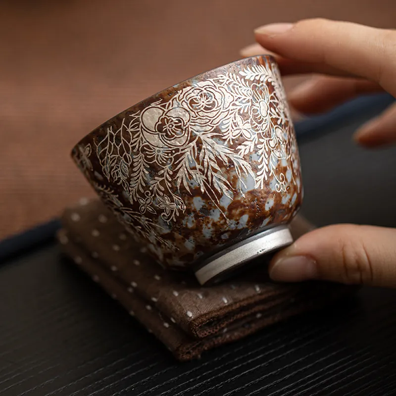 Retro-style coarse clay tea cup with a silver-accent floral finish, designed as a large single host cup for Gongfu tea service. A strong fit for wholesale and bulk teaware programs, it offers artisan shelf appeal and dependable factory-direct supply for tea shops, cafes, and specialty retailers.